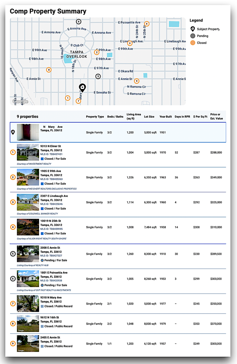 Based on nearby renovated comps, ARV is estimated between $325,000 – $335,000, depending on finish level and configuration as 2/2 or 3/2.